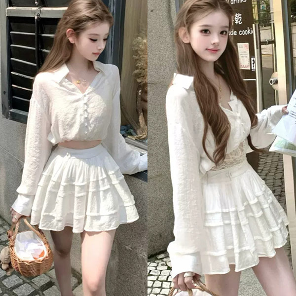甜美短版上衣+短裙+罩杯小可愛-三件組棉麻套裝