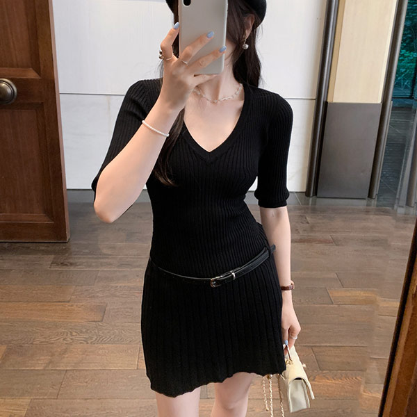 三分鐘優雅|OL針織V領洋裝(下單送腰帶)