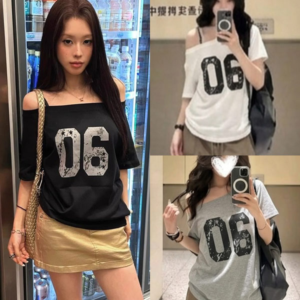 美式街頭寬鬆露肩長版T上衣