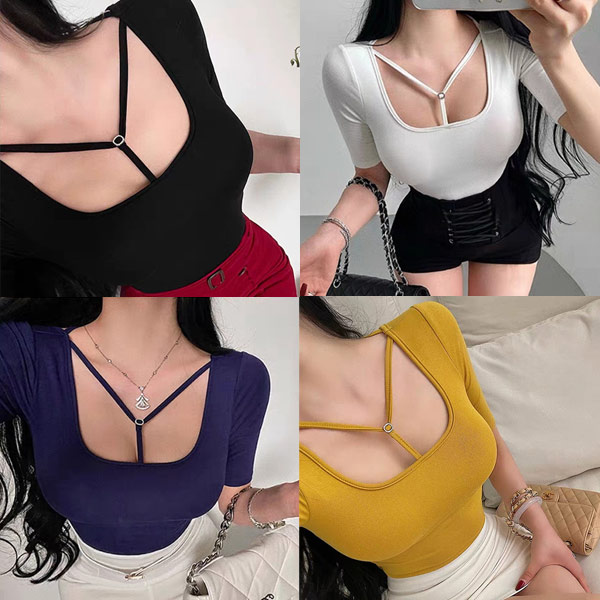 性感藏肉低胸五分袖上衣(附胸墊)