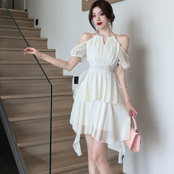 修飾梨形身材|雪紡露肩層次感洋裝
