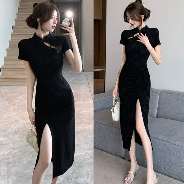 極致勾勒|性感旗袍壓花開岔中長裙洋裝