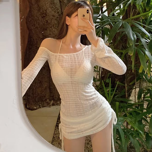 性感泡泡紋比基尼泳衣+露肩半透罩衫