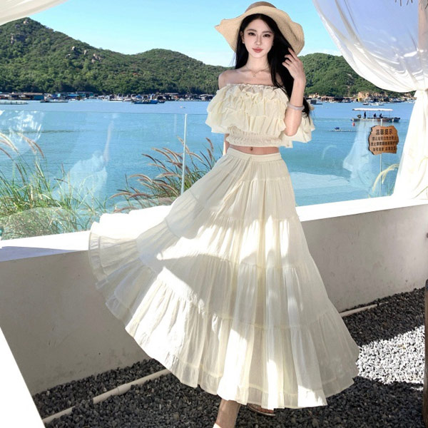 渡假氛圍露肩短版上衣+長裙=兩件式套裝