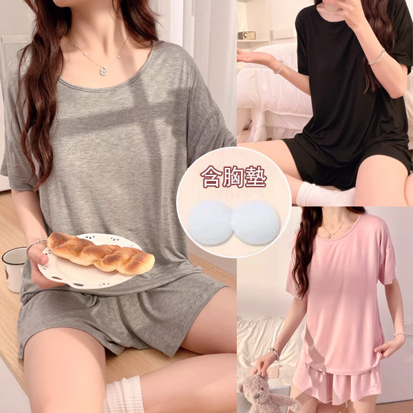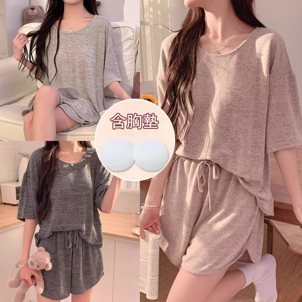 輕鬆休閒T恤睡衣+睡褲居家服套裝(有胸墊-防凸點)