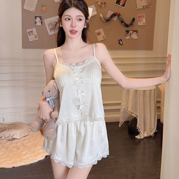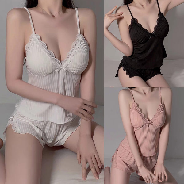 小性感細肩帶垂領睡衣+短褲-居家服(有胸墊)