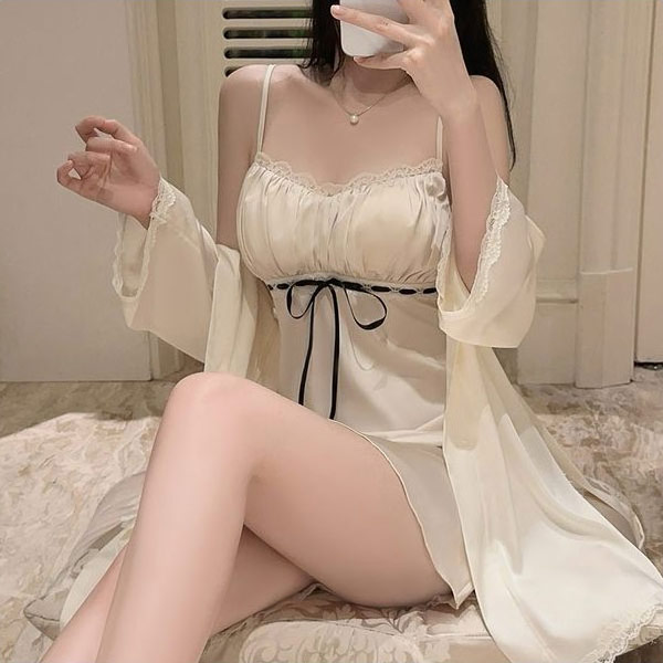 性感水溶蕾絲緞面睡衣+睡袍(有可拆胸墊)