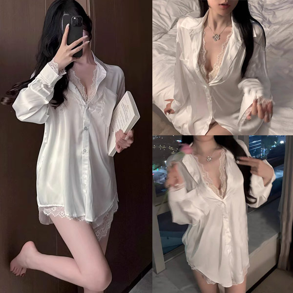 男友風襯衫蕾絲緞面睡衣+睡褲