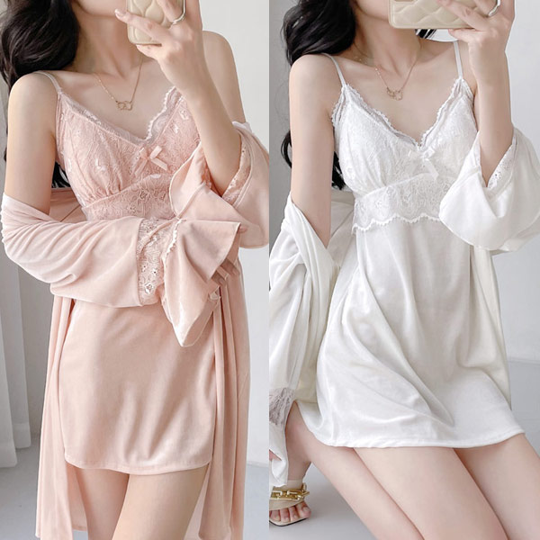 純慾款金絲絨蕾絲睡衣+睡袍(有可拆胸墊)