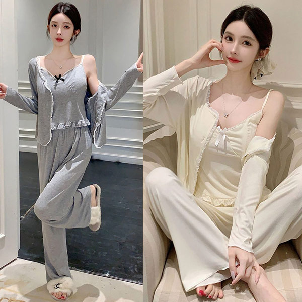 居家服三件組舒適睡衣+睡褲+睡袍(有可拆胸墊)