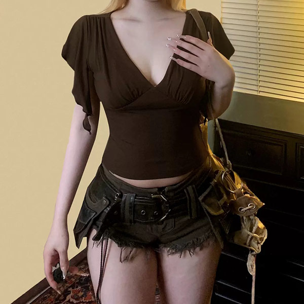 5折-優雅小飛袖V領抓皺上衣-現貨