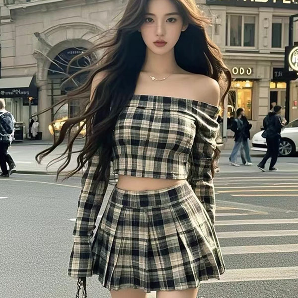 5折-英倫風格紋-露肩短上衣+百褶短裙(褲型內裡)=套裝-現貨