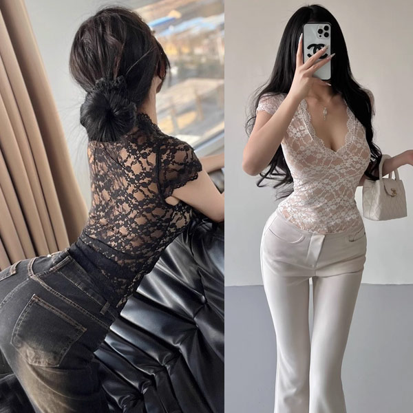 5折-亮片奢華微透膚蕾絲上衣-現貨