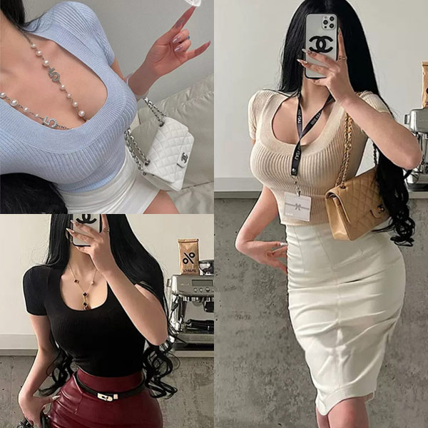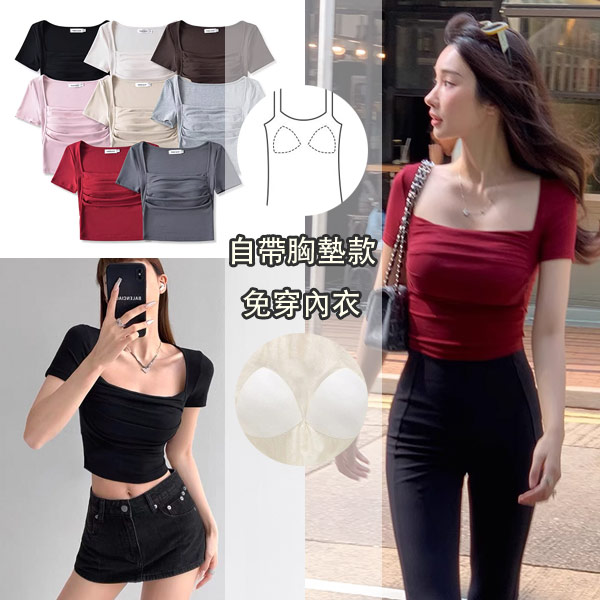 方領短版露腰棉質上衣(附可拆胸墊)-現貨