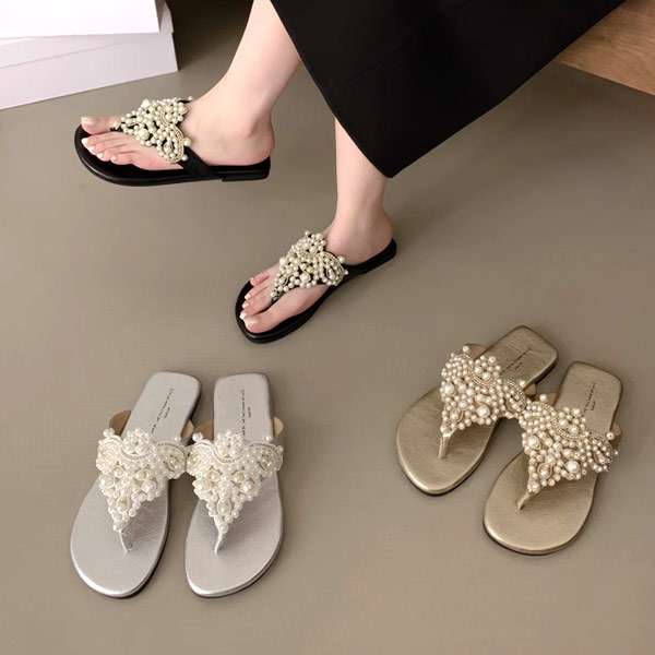 低調奢華珍珠水鑽重工夾腳涼拖鞋-現貨