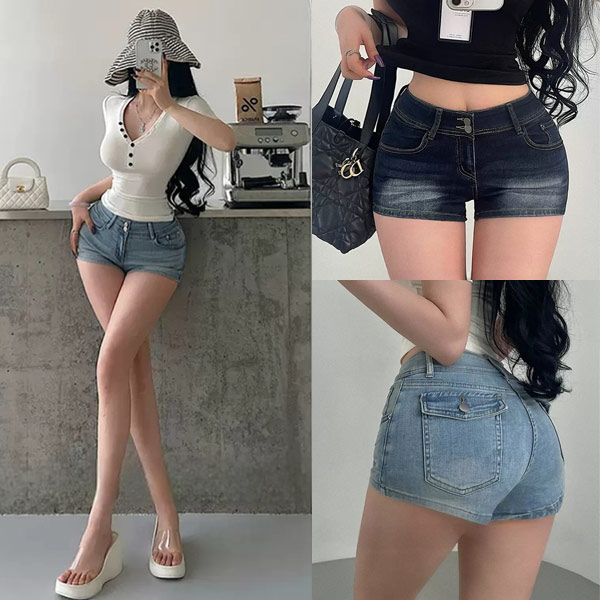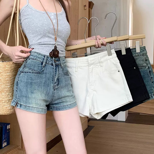 休閒口袋拉鍊高腰牛仔短褲-現貨