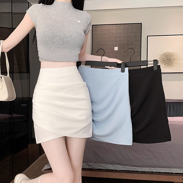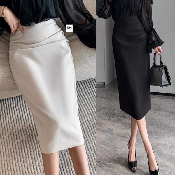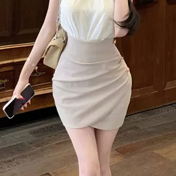 5折-氣質通勤抓皺襟扣包臀短裙-現貨