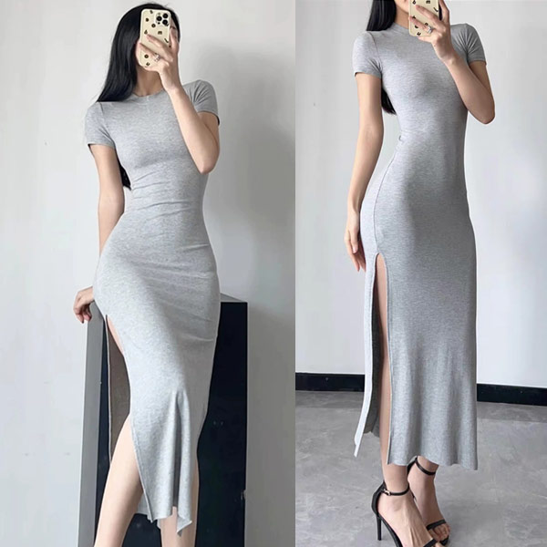 休閒合身開岔長洋裝-現貨